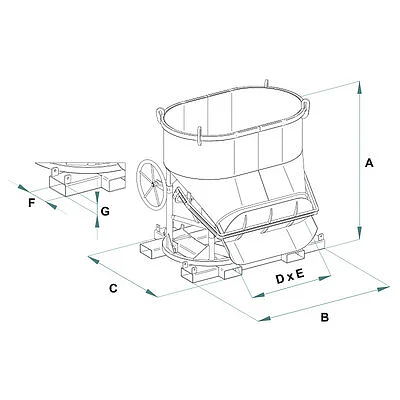 The BOT-GAV model is an oval-shaped concrete bucket specifically designed to excel in concrete pouring operations, especially in the prefabrication sector. It features a side discharge with a guillotine closure and a wide opening controlled by two lateral levers, ensuring optimal control of concrete during the discharge process for efficient and safe flow. The forkable base allows quick and safe lifting via forklift or telehandler, enhancing productivity and reducing downtime. Crane lifting is facilitated through four lifting points to ensure stability. The finish is powder-coated in RAL 1003 color. Available in various sizes and capacities, as specified in the table below, the BOT-GAV model can be customized to meet the specific requirements of your project.