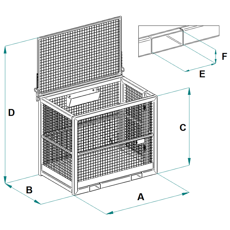 A mesh container designed to facilitate routine maintenance, specifically designed for use with forklifts. This practical solution features an internal tool compartment, a side door that opens inward with an appropriate locking system, and a stop specifically designed to prevent the container from slipping off the forklift tines.